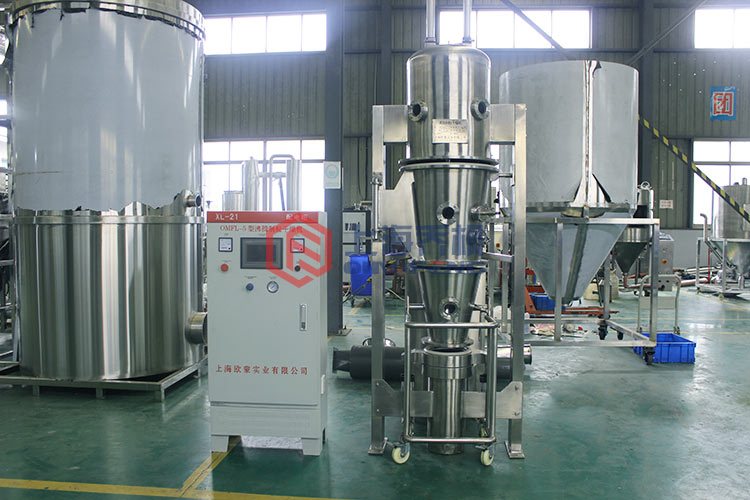 粉狀物料投入料斗密閉容器內,由于熱氣流的作用,使粉末懸浮呈流化狀循環流動,達到均勻混合,同時噴入霧狀粘結劑潤濕容器內的粉末,使粉末凝成疏松的小顆粒,成粒的同時,由于熱氣流對其作高效干燥,水份不斷蒸發,粉末不斷凝固,引過程重復進行,形成理想的,均勻的多微孔球狀顆粒,在容器中一次完成混合,造粒,干燥三個工序。