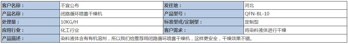物料屬于:染料液體含有有機溶劑,所以采用的是我們閉路循環噴霧干燥機,這樣更安全,干燥效果不錯,閉路循環噴霧干燥機也可稱為:有機溶劑噴霧干燥機或閉式循環噴霧干燥機等。