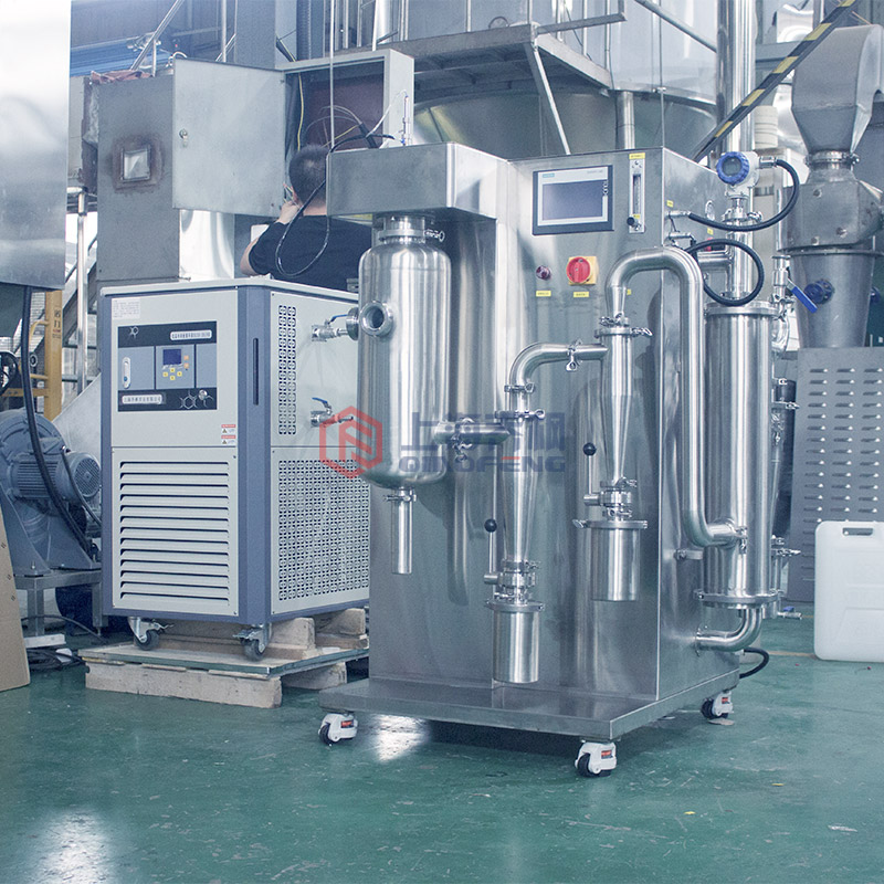 首先,液態(tài)物質被送入噴霧器中,在高速噴嘴的作用下,噴出微小的顆粒狀物料形成霧滴,然后這些霧滴在干燥室中與高溫高壓的熱風相互作用。在瞬間高溫高壓作用下,霧滴逐漸失去水分,由此升高了氣體的濕度,并在空氣的擾動和攪拌下,將干燥室內(nèi)氣體的溫度和濕度保持在一定的范圍內(nèi)。