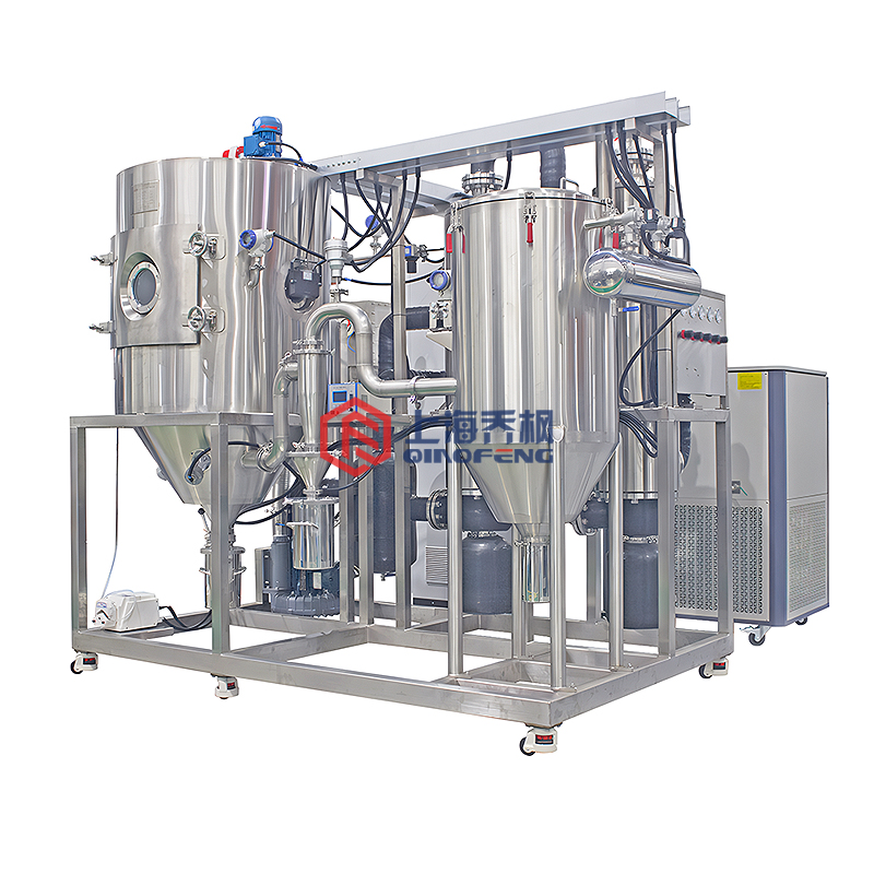 設備主要由:送料系統(tǒng)、加熱系統(tǒng)、霧化系統(tǒng)、噴霧干燥系統(tǒng)、惰性氣體循環(huán)系統(tǒng)、產(chǎn)品回收系統(tǒng)、冷凝系統(tǒng)組成。